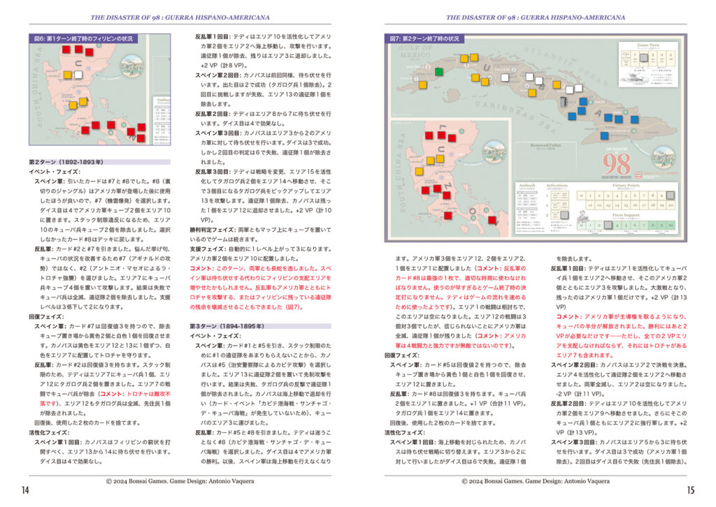 少し長めの(1ターン丸ごととか)「プレイの例」をルールブックに掲載する時、タイトルのような注意書きを目にされた方も多いと思います。多くのゲーム・デザイナーにとってはそのままの意味でしょうが、自分の場合はなるべくそれっぽい=お手本となりそうなプレイの例にするけれど、後でもっと良い手が見つかったらすんまへん、という謙虚な? 思いも込めております。実際のところ、デザイナー諸氏はどうお考えなんでしょうね、と常々思っておりましたが、ゲームマーケット2024春で初売り予定の『1898年の大厄災: 米西戦争』のアントニオ・ヴァケラ氏は攻めた「プレイの例」を用意してくれました。テストプレイの展開をそのまま「例」としてもってきて、そこに自ら良い点・悪い点をコメントするという内容です。