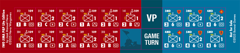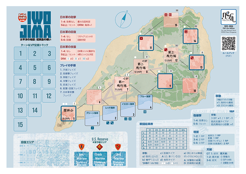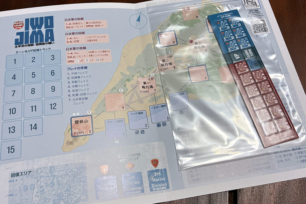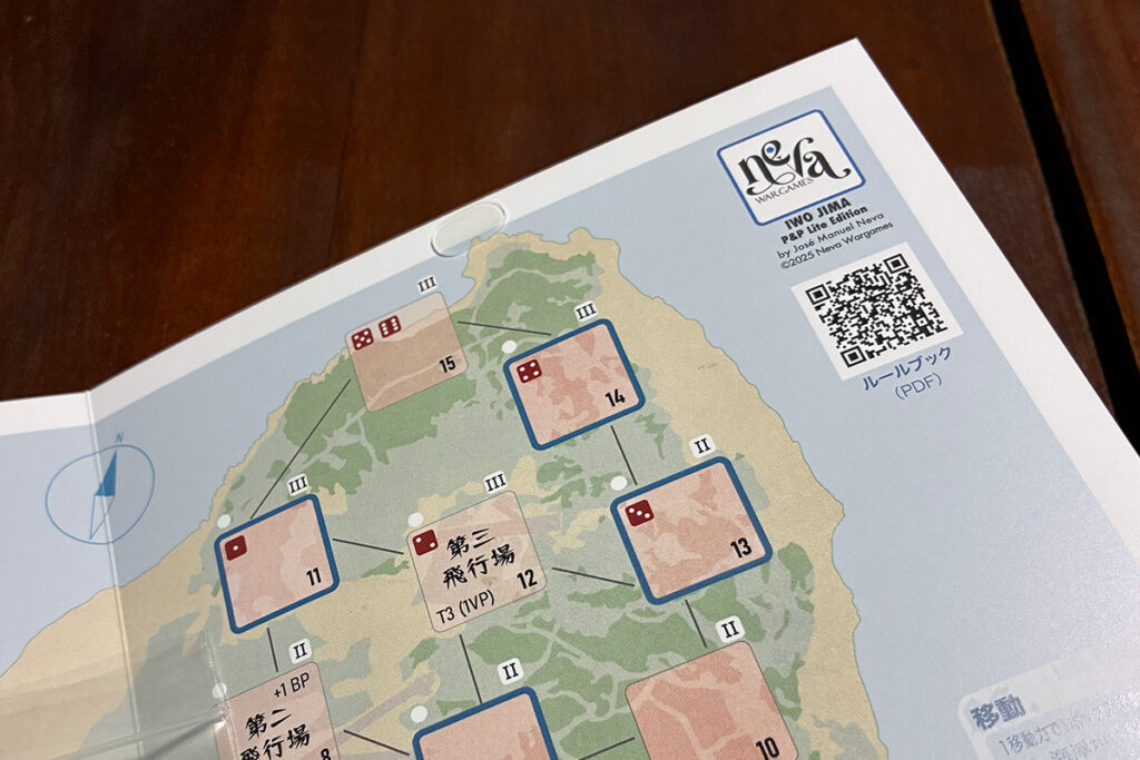 Neva Wargamesのプリント&プレイ版の『Iwo Jima』が印刷されているのです。プレイヤーが米海兵隊を率い、「硫黄島の戦い」に挑むソリティア・ゲーム。ルールブックはQRコード(二次元コード)から。ちなみに『Iwo Jima』の製品版は年内発売予定です。