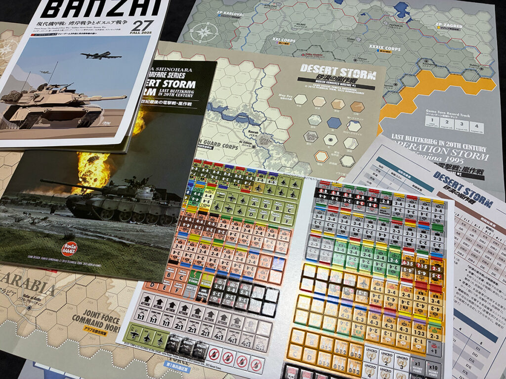 1991年の砂漠の嵐作戦と、1995年の嵐作戦をシミュレーションした作戦級ゲームが付録のBANZAIマガジン第27号、本日より予約開始です(発売は21日)。ルールは「ドイツ戦車軍団」くらいの難易度ながら、エアランド・バトルが体感できるシステム(砂漠の嵐作戦)や、国際世論が勝利条件──軍事行動に関わるイベント(嵐作戦)が盛り込まれています。何より、どちらも4ターンで終わるのが忙しい現代人には嬉しい(その分、1ターンの密度が濃いのです)。