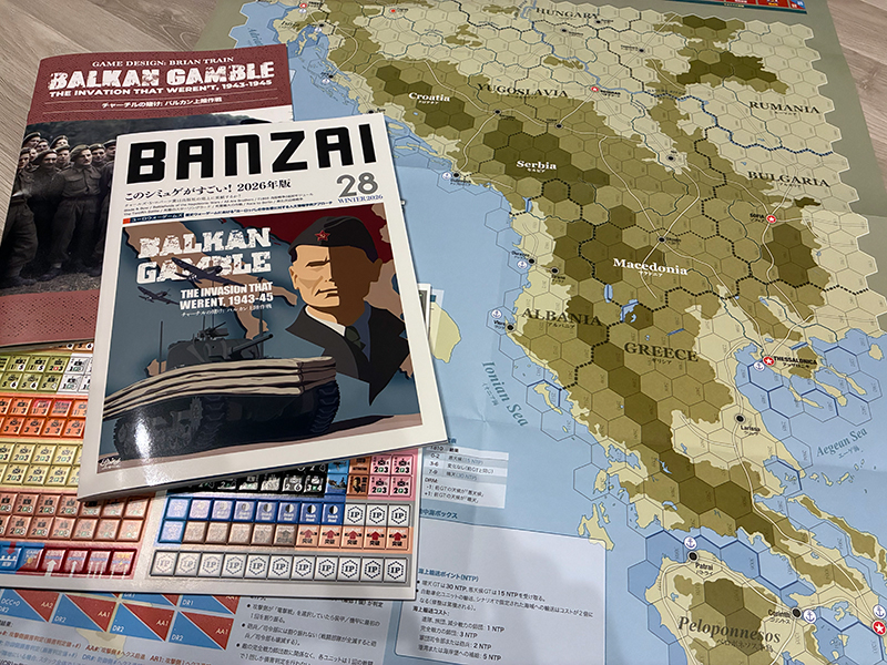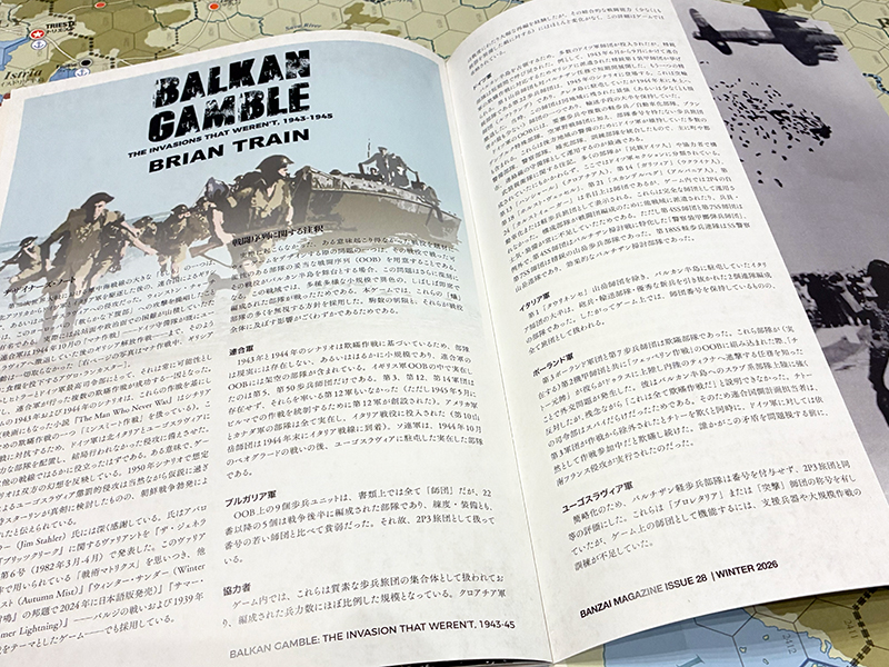 来週金曜日にBANZAIマガジン最新刊が発売されます。付録ゲームはブライアン・トレイン氏の『Balkan Gamble』の日本語版『チャーチルの賭け: バルカン侵攻作戦』です。本作はDecision Gamesから『Balkan Gambit』のタイトルでもリリースされました。もともと「戦術マトリクス」が特徴だった本作ですが、DG版では『Victory in Normandy』のシステムに改められ、いろいろあったようです。『チャーチルの賭け』はオリジナルに準拠していますが、ViNの戦闘解決方法も選択ルールとして紹介しています。