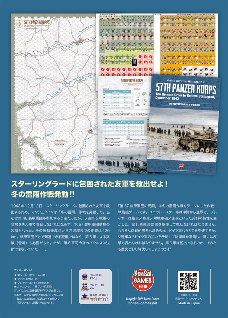 『第57装甲軍団の死闘』は、1942年12月12日から23日までアクサイ川とミシュコワ川の間で行われた戦いを描いた、大隊/連隊レベルのシミュレーション・ゲームです。プレイヤーはドイツ第57装甲軍団、またはソ連第51軍及び第2親衛軍を指揮します。本作では、戦車、歩兵、砲兵といった各兵科の特色を重視した「第48戦車軍団システム」が採用されています。ドイツ軍プレイヤーは、その強力な戦力で第6軍への道を開き、スターリングラードに包囲された友軍が脱出できるようにしなければなりません。