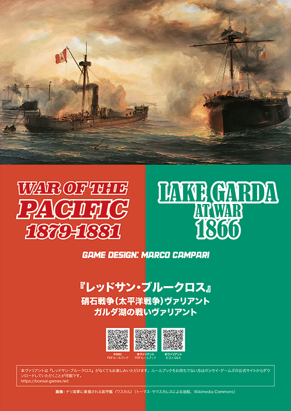 レッドサン・ブルークロス』のシステムを使って硝石戦争(BANZAIマガジン第15号に収録)と第三次イタリア独立戦争中のガルダ湖における戦いを再現するヴァリアント集です。元ゲームをお持ちでない場合も、ルールブックをダウンロードすればプレイ可能です。