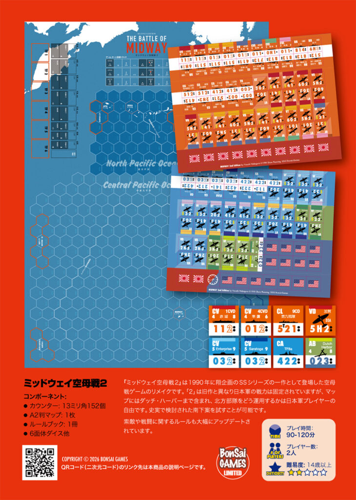 第2版は両軍の戦力を史実通りに固定する代わりに、マップを北太平洋まで広げて北方作戦もカバー。日本軍は史実通りにダッチ・ハーバーを空襲することも、ペナルティ覚悟で北方部隊を早期に南下させることも、あるいは米軍が北方部隊だけを叩くことも可能になっています。北方作戦をオミットして日本軍の戦力をランダムに決める、初版に近いゲームを楽しめる選択ルールも用意しております。